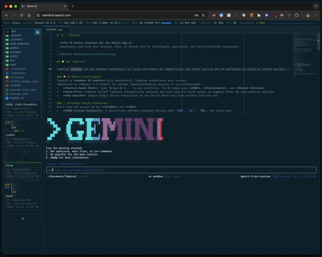 Tabminal 是一个跑在浏览器里的终端,它把会话存在服务器上,还接入了 AI。你可以在电脑、平板或手机上打开就用,工作状态不会丢。它就是为了移动办公和那些喜欢折腾命令行的人做的。