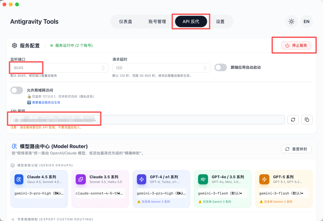 未启动状态,右侧显示的是启动服务字样,点击启动即可。监听端口和 API 密钥是关键参数。