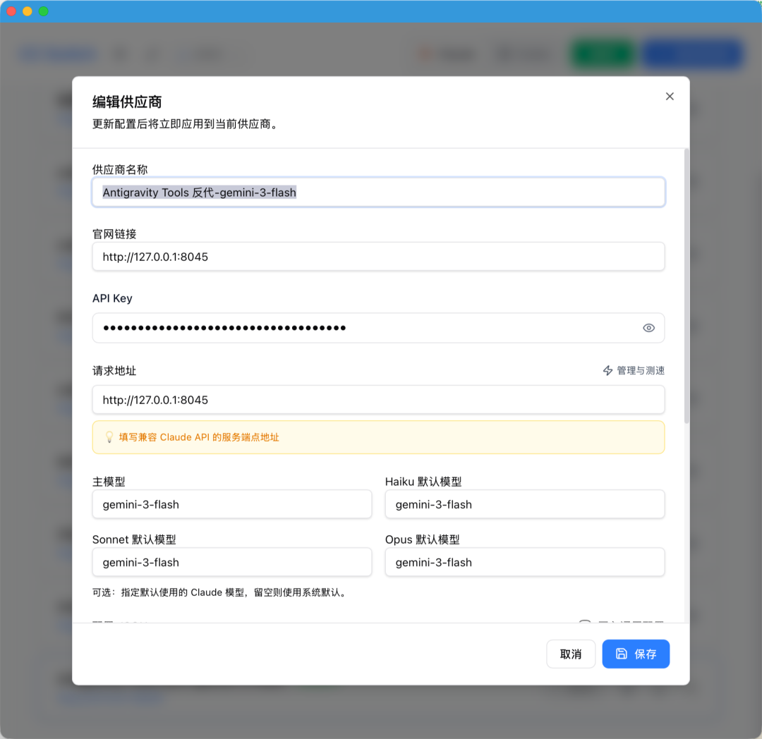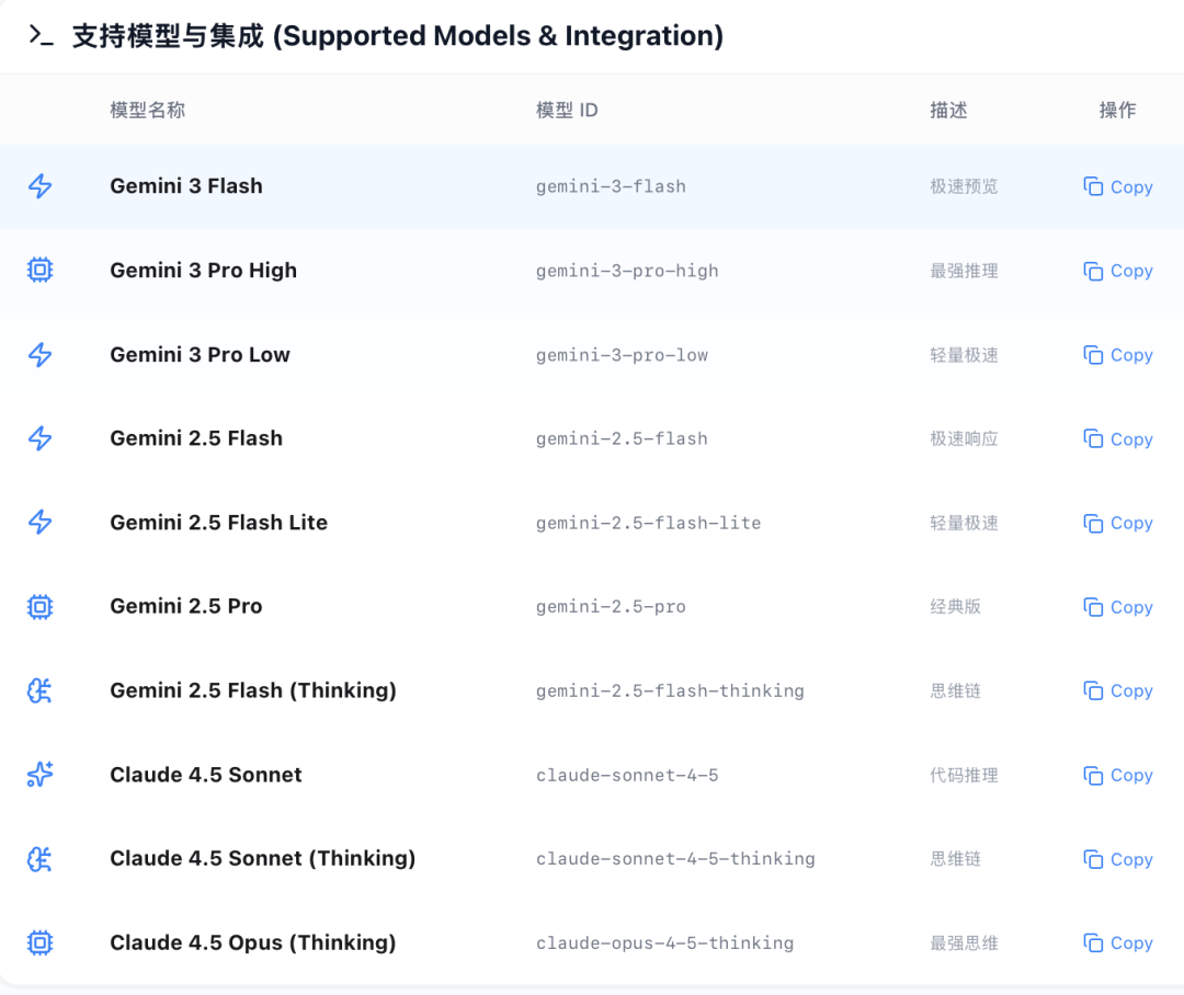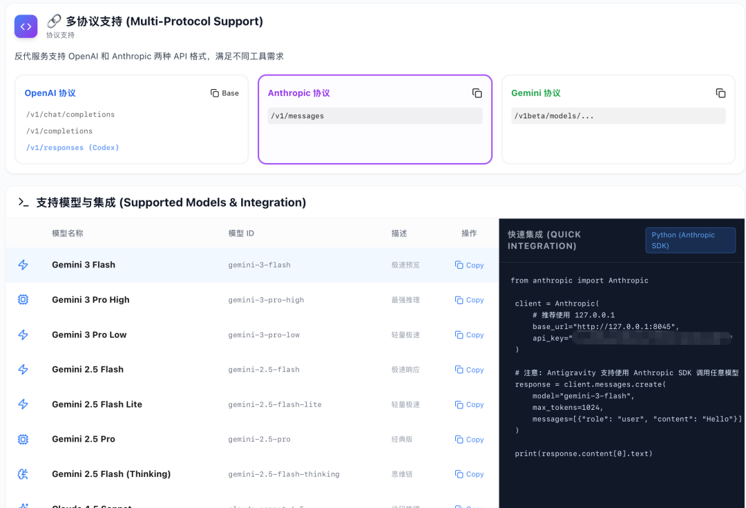 界面往下拉,看到下面,支持 OpenAI 协议、Anthropic 协议和 Gemini 协议,也就是说还可以在 Codex 和 Gemini Cli 中使用。但是如果在 Codex 接入,需要加一个模型映射,比如把 gpt-5-codex 映射到 gemini-3-pro-high。