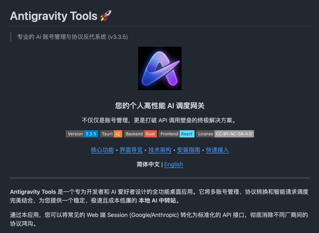 就要用到上面截图中的这个工具了,一个非常牛逼的开源工具,叫做 Antigravity Tools。