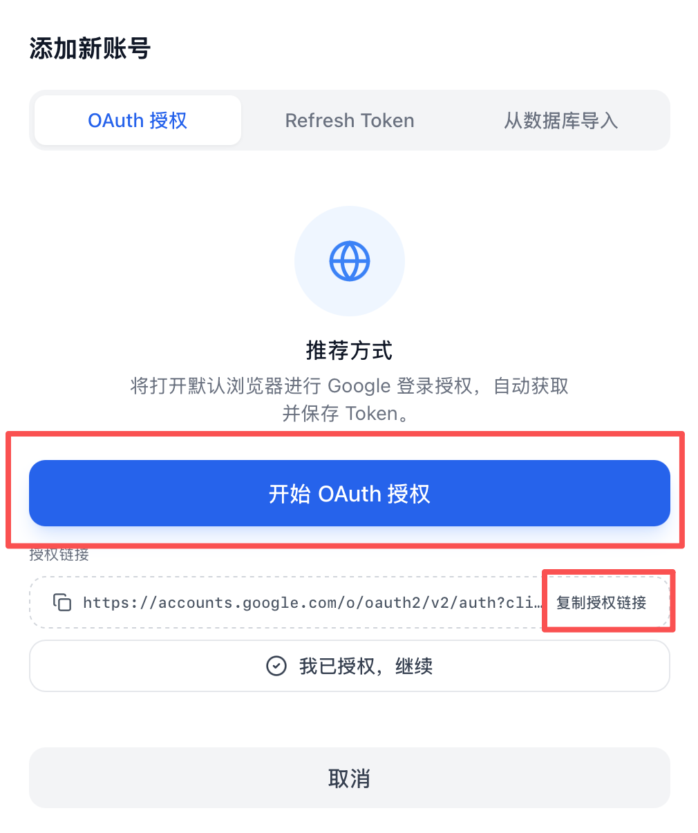 可以点「开始 OAuth 授权」,这样会自动打开默认浏览器,如果你有 Google 账号,自动完成登录授权,回到这个界面,授权成功,账号就添加上了。