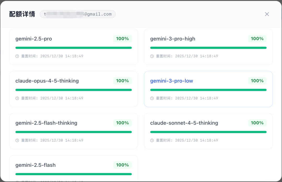 点击每个账号后面的「信息」图标,可以查看具体每个模型的使用量。